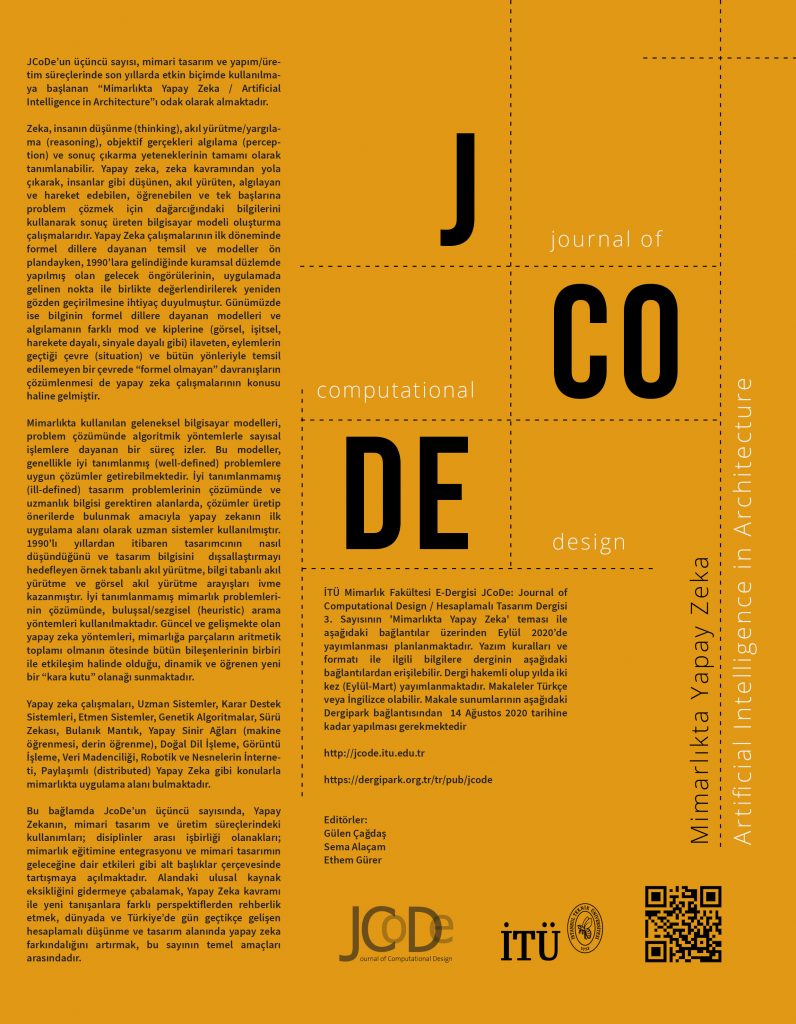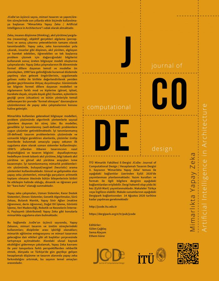 İTÜ Mimarlık Fakültesi E-Dergisi JCoDe: Journal of Computational Design / Hesaplamalı Tasarım Dergisi 3. Sayısının ‘Mimarlıkta Yapay Zeka’ teması (bkz. ekli dosya) ile aşağıdaki bağlantılar üzerinden Eylül 2020’de yayımlanması planlanmaktadır; yazım kuralları ve formatı ile ilgili bilgilere derginin aşağıdaki bağlantılarından erişilebilir. Makale sunumlarının aşağıdaki Dergipark bağlantısından 14 Ağustos 2020 tarihine kadar yapılması gerekmektedir.